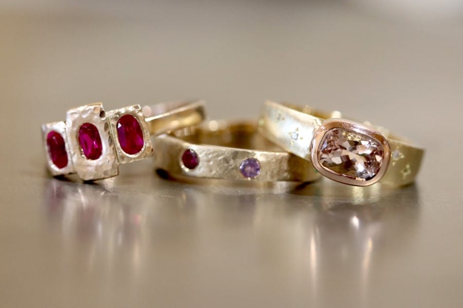 Yellow gold rings with rubies, diamonds, morganites and sapphires.