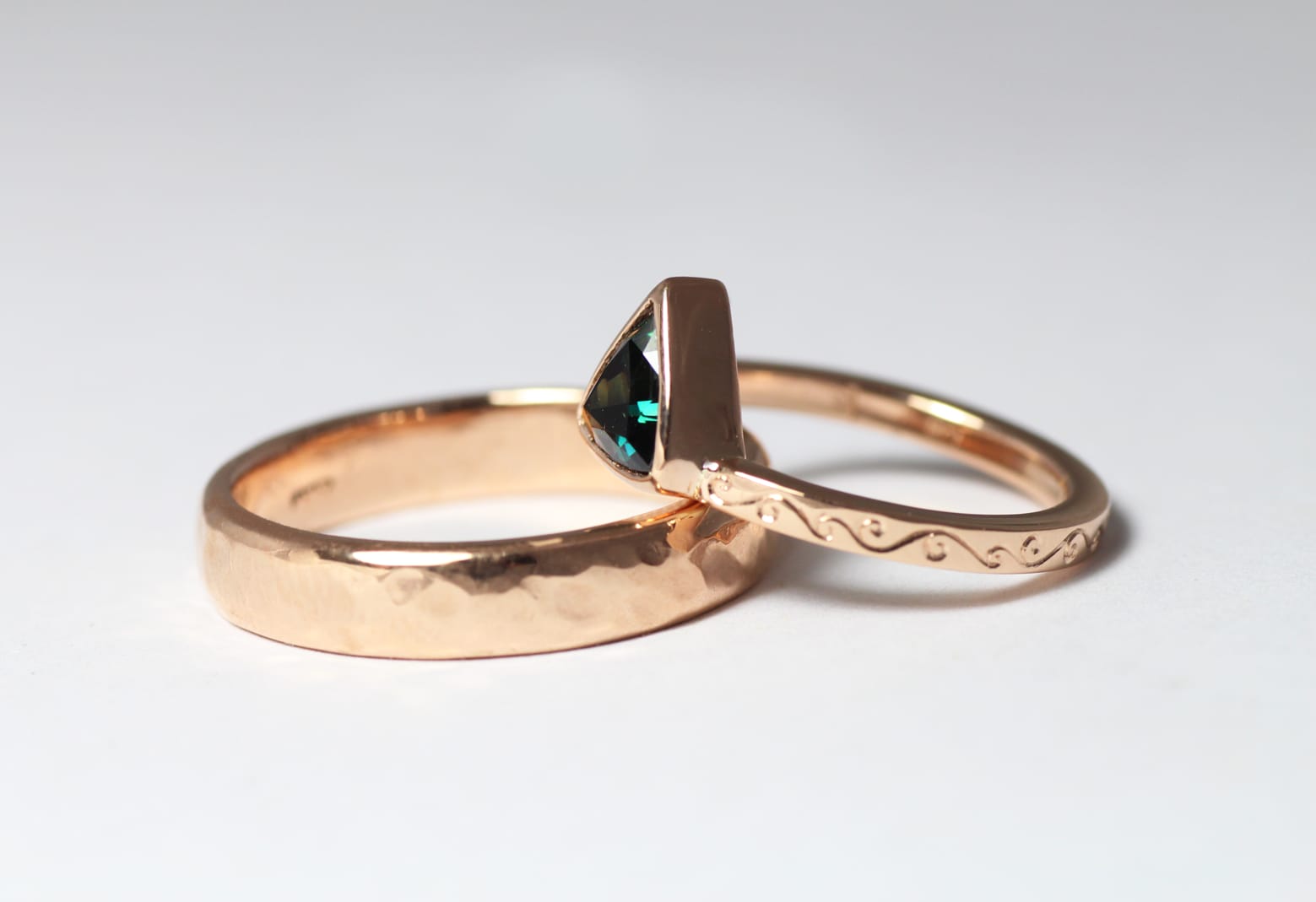 18ct Fairtrade rose gold wedding set with trilliant sapphire