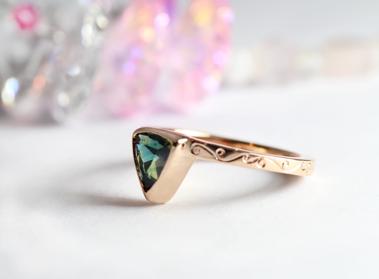 18ct Fairtrade rose gold wedding set with trilliant sapphire