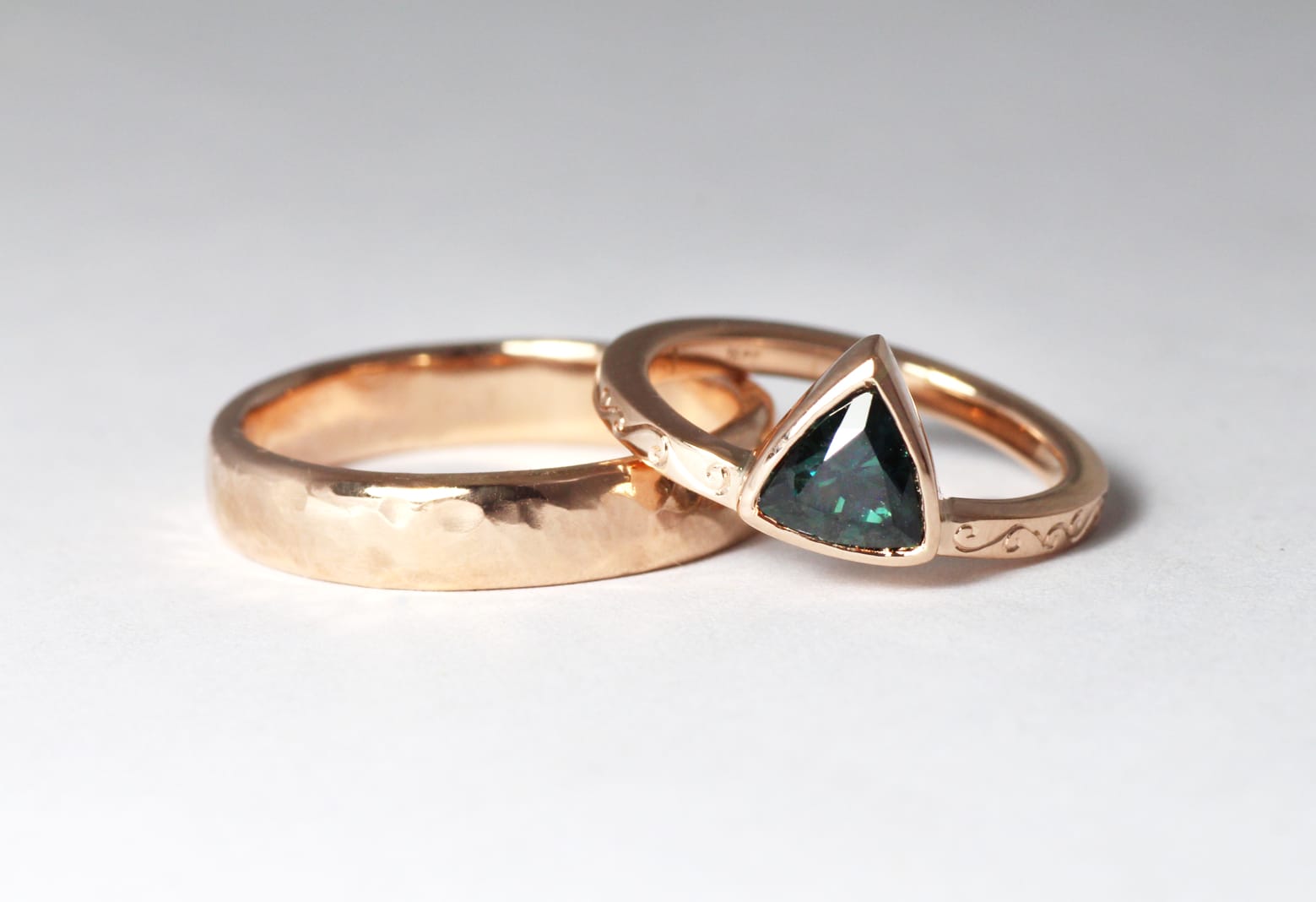 18ct Fairtrade rose gold wedding set with trilliant sapphire