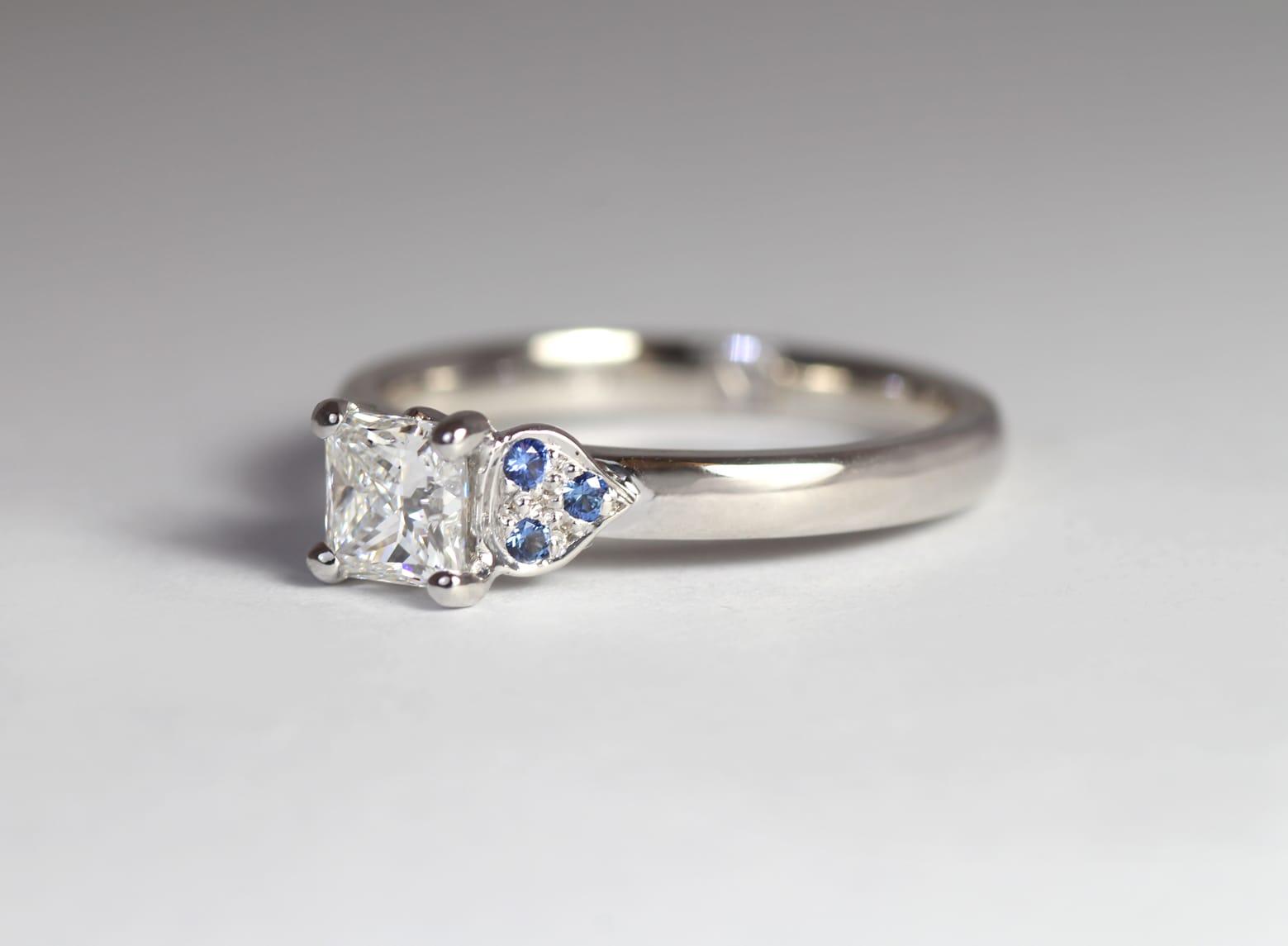 18ct Fairtrade white gold with princess cut diamond and sapphires by Zoe Pook Jewellery
