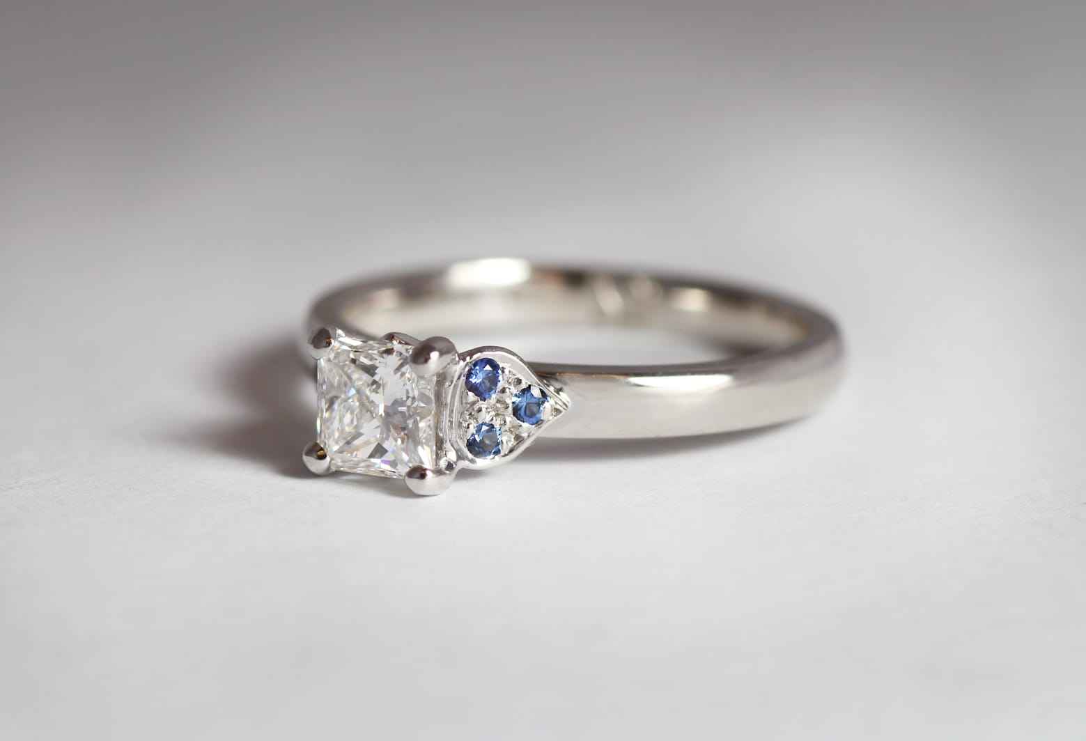 18ct Fairtrade white gold with princess cut diamond and sapphires by Zoe Pook Jewellery