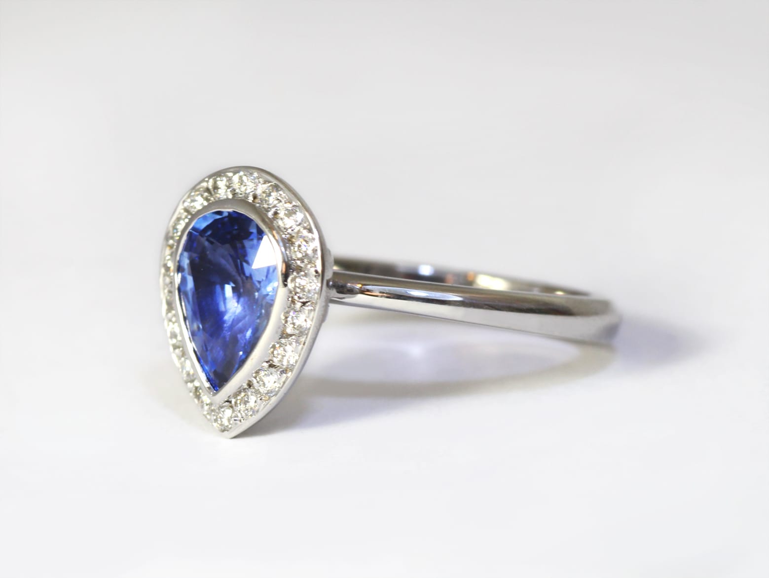 18ct Fairtrade gold with pear sapphire and diamond halo