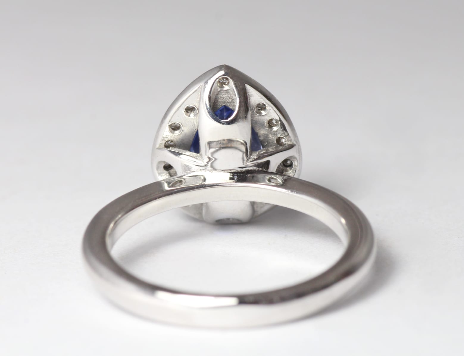 18ct Fairtrade gold with pear sapphire and diamond halo