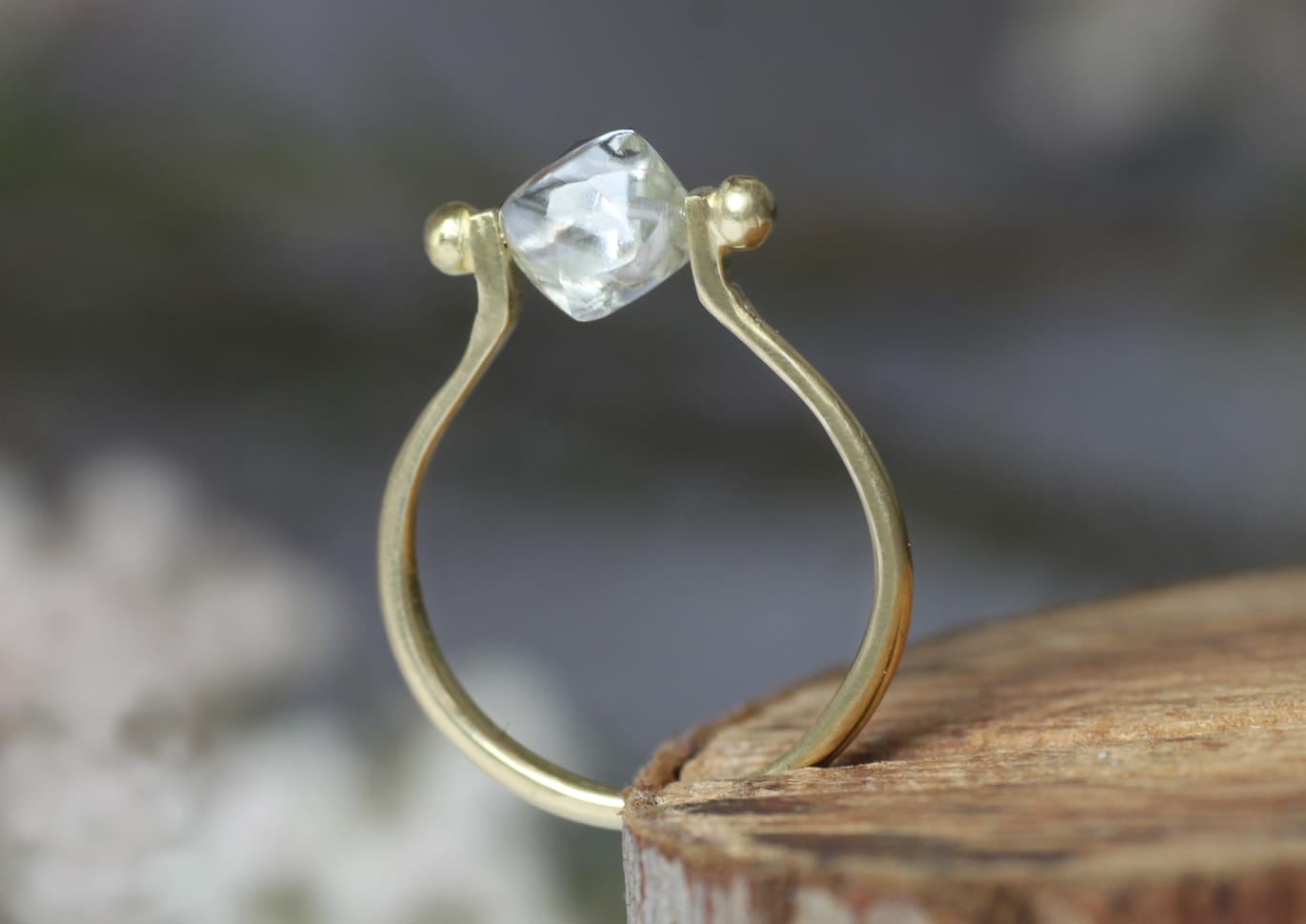 18ct Fairtrade gold with rough diamond on rotating pin setting by Zoe Pook Jewellery