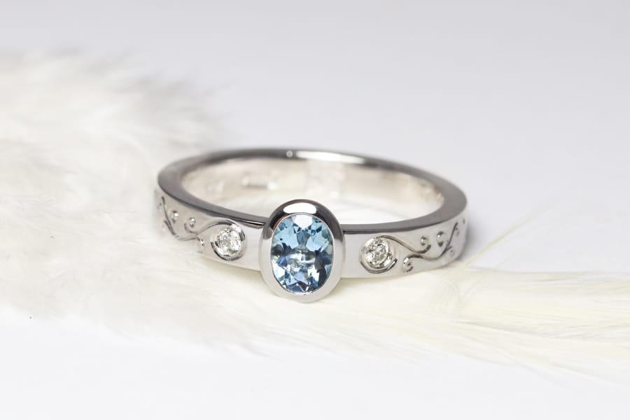 Aquamarine diamonds hand engraving 18ct white