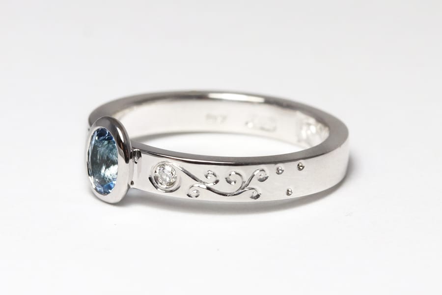Aquamarine diamonds hand engraving 18ct white