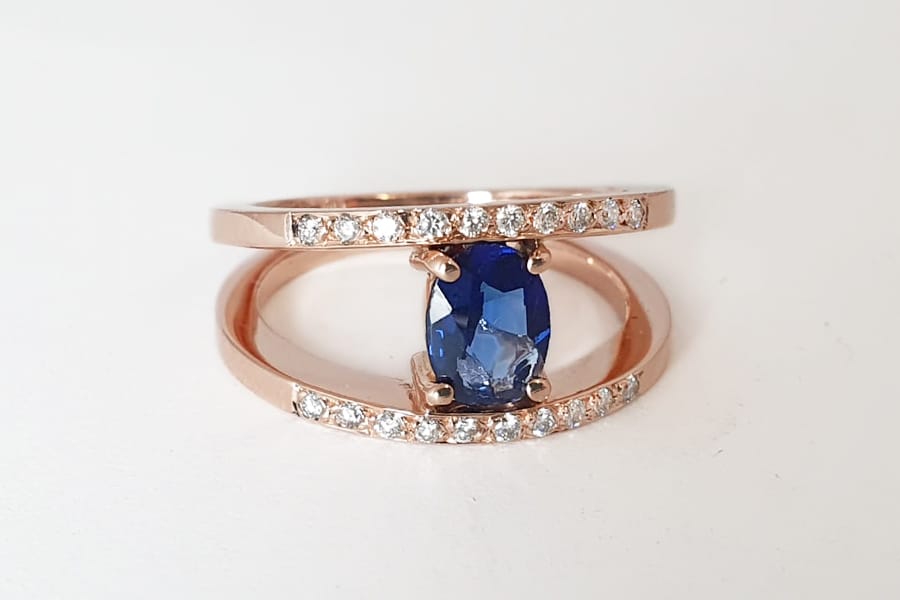 rose gold diamond split band with sapphire