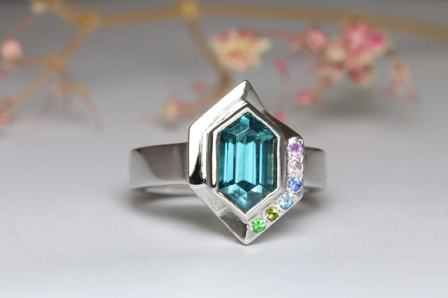 Blue zircon in white gold