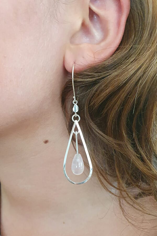 Silver rose quartz earrings on model